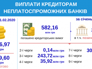 Загальна сума виплат кредиторам неплатоспроможних банків в січні 2020 року склала 582,16 млн грн. Тільки на позачергові виплати Нацбанку було спрямовано 276,56 млн грн.